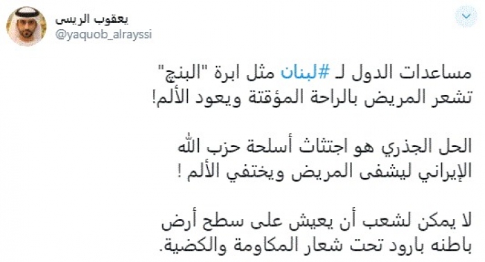 طالب الكاتب الإماراتي يعقوب الريسي، اليوم، باجتثاث سلاح حزب الله من لبنان، مؤكدًا أن ذلك هو الحل الأوحد لأزمة لبنان.