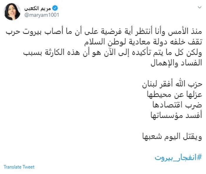 قالت الكاتبة والإعلامية الإماراتية مريم الكعبي، اليوم، إن حزب الله أفقر لبنان وعزلها عن محيطها وضرب اقتصادها وأفسد مؤسساتها.