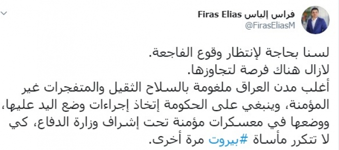 وكتب عبر تغريدة له على "تويتر" رصدها " المشهد العربي": "لسنا بحاجة لانتظار وقوع الفاجعة، لازال هناك فرصة لتجاوزها، أغلب مدن العراق ملغومة بالسلاح الثقيل والمتفجرات غير المؤمنة، وينبغي على الحكومة اتخاذ إجراءات وضع اليد عليها، ووضعها في معسكرات مؤمنة تحت إشراف وزارة الدفاع، كي لا تتكرر مأساة بيروت مرة أخرى"..