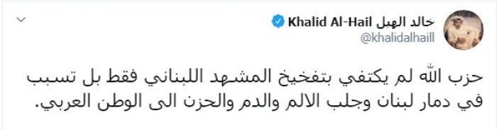 وكتب عبر تغريدة له على "تويتر" رصدها " المشهد العربي": "حزب الله لم يكتفي بتفخيخ المشهد اللبناني فقط بل تسبب في دمار لبنان، وجلب الألم والدم والحزن إلى الوطن العربي".
