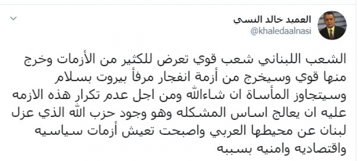 وكتب عبر تغريدة له على "تويتر" رصدها " المشهد العربي": "الشعب اللبناني شعب قوي تعرض للكثير من الأزمات وخرج منها قوي وسيخرج من أزمة انفجار مرفأ بيروت بسلام وسيتجاوز المأساة إن شاءالله، ومن أجل عدم تكرار هذه الأزمة عليه أن يعالج أساس المشكلة وهو وجود حزب الله الذي عزل لبنان عن محيطها العربي وأصبحت تعيش أزمات سياسية واقتصادية وأمنية بسببه".