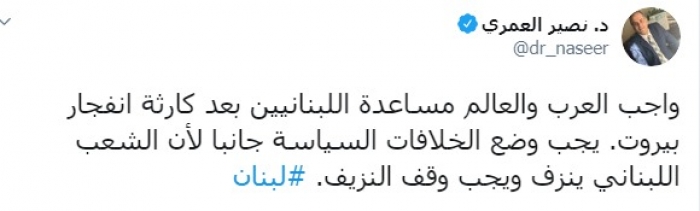 وكتب عبر تغريدة له على "تويتر" رصدها " المشهد العربي": "واجب العرب والعالم مساعدة اللبنانيين بعد كارثة انفجار بيروت، يجب وضع الخلافات السياسة جانبا لأن الشعب اللبناني ينزف ويجب وقف النزيف"