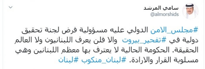 طالب المحلل السياسي السعودي، سامي المرشد، اليوم الأربعاء، بلجنة تحقيق دولية في تفجير بيروت.