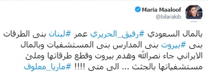 وكتبت عبر تغريدة لها على "تويتر" رصدها " المشهد العربي":"بالمال السعودي رفيق الحريري عمر لبنان بنى الطرقات بنى بيروت بنى المدارس بنى المستشفيات، وبالمال الإيراني جاء نصرالله وهدم بيروت وقطع طرقاتها وملئ مستشفياتها بالجثث، إلى متى".