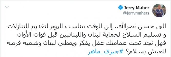 وكتب عبر تغريدة له على "تويتر" رصدها " المشهد العربي": "إلى حسن نصرالله، الآن الوقت مناسب اليوم لتقديم التنازلات و تسليم السلاح لحماية لبنان واللبنانيين قبل فوات الأوان فهل نجد تحت عمامتك عقل يفكر ويعطي لبنان وشعبه فرصة للعيش بسلام".