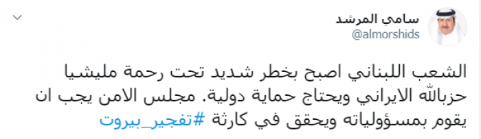 وكتب عبر تغريدة له على "تويتر" رصدها " المشهد العربي":"الشعب اللبناني أصبح بخطر شديد تحت رحمة مليشيا حزب الله الإيراني ويحتاج حماية دولية، مجلس الأمن يجب أن يقوم بمسؤولياته ويحقق في كارثة تفجير بيروت".
