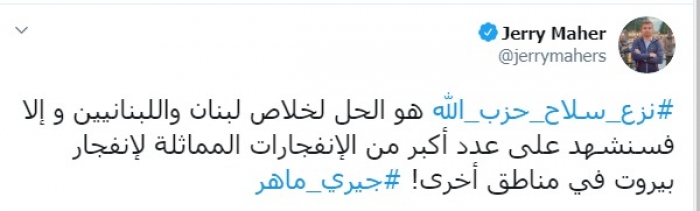 طالب الكاتب الصحفي اللبناني جيري ماهر، اليوم الخميس، بنزع سلاح حزب الله الإرهابي.