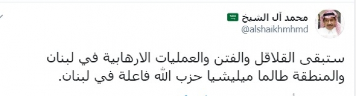 وكتب عبر تغريدة له على "تويتر" رصدها " المشهد العربي": "ستبقى القلاقل والفتن والعمليات الإرهابية في لبنان والمنطقة طالما ميليشيا حزب الله فاعلة في لبنان".