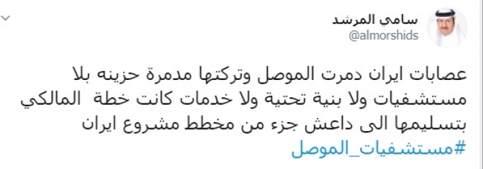 وكتب عبر تغريدة له على "تويتر" رصدها " المشهد العربي": "عصابات إيران دمرت الموصل وتركتها مدمرة حزينة بلا مستشفيات ولا بنية تحتية ولا خدمات، كانت خطة المالكي بتسليمها إلى داعش جزء من مخطط مشروع إيران ".