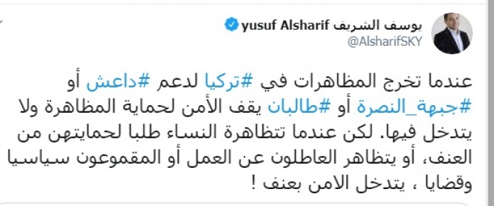 وكتب عبر تغريدة له على "تويتر" رصدها " المشهد العربي": "عندما تخرج المظاهرات في تركيا لدعم داعش أو جبهة النصرة أو طالبان يقف الأمن لحماية المظاهرة ولا يتدخل فيها، لكن عندما تتظاهر النساء طلبا لحمايتهن من العنف، أو يتظاهر العاطلون عن العمل أو المقموعون سياسيا وقضايا ، يتدخل الأمن بعنف".