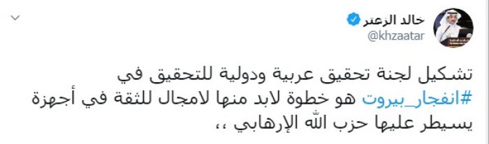 وكتب عبر تغريدة له على "تويتر" رصدها " المشهد العربي": "تشكيل لجنة تحقيق عربية ودولية للتحقيق في انفجار بيروت هو خطوة لابد منها لامجال للثقة في أجهزة يسيطر عليها حزب الله الإرهابي ".