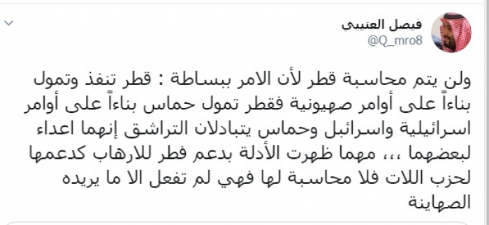 وكتب عبر تغريدة له على "تويتر" رصدها " المشهد العربي":"لن يتم محاسبة قطر لأن الأمر ببساطة ، قطر تنفذ وتمول بناءاً على أوامر صهيونية، فقطر تمول حماس بناءاً على أوامر اسرائيلية وإسرائيل وحماس يتبادلان التراشق إنهما أعداء لبعضهما، مهما ظهرت الأدلة بدعم قطر للإرهاب كدعمها لحزب اللات فلا محاسبة لها فهي لم تفعل إلا ما يريده الصهاينة".