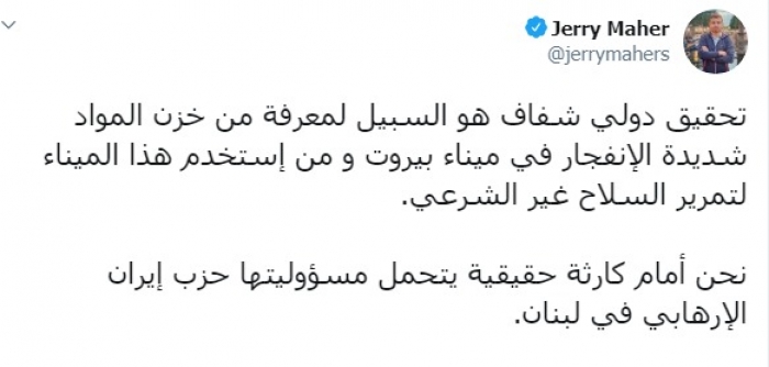 وكتب عبر تغريدة له على "تويتر" رصدها " المشهد العربي": "تحقيق دولي شفاف هو السبيل لمعرفة من خزن المواد شديدة الانفجار في ميناء بيروت و من استخدم هذا الميناء لتمرير السلاح غير الشرعي، نحن أمام كارثة حقيقية يتحمل مسؤوليتها حزب إيران الإرهابي في لبنان".