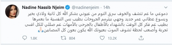وكتبت نادين، فى تغريدة عبر حسابها الشخصى على موقع التواصل الاجتماعى "تويتر"، "دموعى ما عم تنشف والخوف سرق النوم من عيونى.. بشكر الله كل ثانية ولادى بخير.. ويسوع عطانى عمر جديد.. وجهى بيترمم الجروحات بطيب بس النفسية ما بعمرها بطيب.. عم فكر كل الوقت بالشهداء بالأطفال بالجرحى بالأمهات.. عم صللى للكل.. أقسى تجربة وأصعب لحظة تشوف الموت بعيونك.. الله يكون بعون كل المصابين".