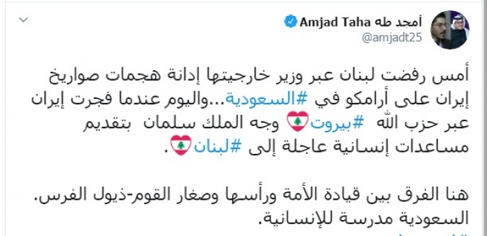 وكتب عبر تغريدة له على "تويتر" رصدها " المشهد العربي": "أمس رفضت لبنان عبر وزير خارجيتها إدانة هجمات صواريخ إيران على أرامكو في السعودية، واليوم عندما فجرت إيران عبر حزب الله بيروت وجه الملك سلمان بتقديم مساعدات إنسانية عاجلة إلى لبنان، هنا الفرق بين قيادة الأمة ورأسها وصغار القوم-ذيول الفرس، السعودية مدرسة للإنسانية".