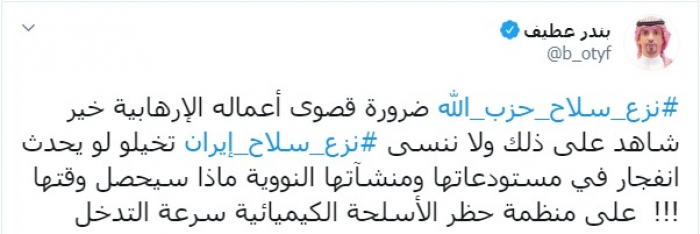طالب الإعلامي السعودي بندر عطيف، اليوم الخميس، بضرورة نزع سلاح حزب الله وإيران.
