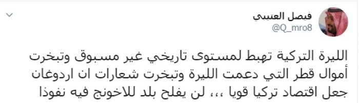 وكتب عبر تغريدة له على "تويتر" رصدها " المشهد العربي": "الليرة التركية تهبط لمستوى تاريخي غير مسبوق وتبخرت أموال قطر التي دعمت الليرة وتبخرت شعارات أن أردوغان جعل اقتصاد تركيا قويا، لن يفلح بلد للإخونج فيه نفوذا".