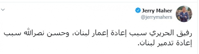 وكتب عبر تغريدة له على "تويتر" رصدها " المشهد العربي": "رفيق الحريري سبب إعادة إعمار لبنان، وحسن نصرالله سبب إعادة تدمير لبنان".