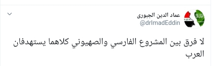 وكتب عبر تغريدة له على "تويتر" رصدها " المشهد العربي" : "لا فرق بين المشروع الفارسي والصهيوني كلاهما يستهدفان العرب".