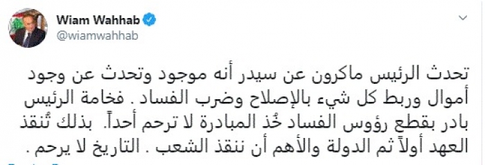 طالب السياسي اللبناني البارز وئام وهاب، اليوم، الرئيس اللبناني ميشال عون، بقطع رؤوس الفساد في لبنان.