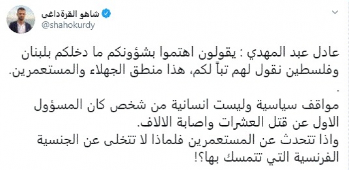 وقال في تغريدة عبر "تويتر" رصدها "المشهد العربي": " عادل عبد المهدي: يقولون اهتموا بشؤونكم ما دخلكم بلبنان وفلسطين نقول لهم تباً لكم، هذا منطق الجهلاء والمستعمرين. مواقف سياسية وليست إنسانية من شخص كان المسؤول الأول عن قتل العشرات وإصابة الآلاف".