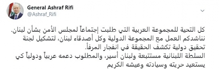 أشاد الوزير اللبناني السابق اللواء أشرف ريفي، بالمجموعة العربية التي طلبت اجتماعًا لمجلس الأمن بشأن لبنان، مُطالبًا بدعم لبنان عربيًا ودوليًا حتى استعادة حريته وسيادته.