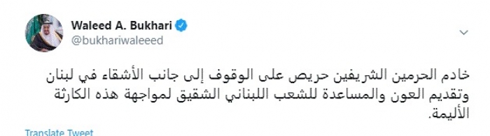 وكتب في تغريدة عبر "تويتر" رصدها "المشهد العربي": "خادم الحرمين الشريفين حريص على الوقوف إلى جانب الأشقاء في لبنان وتقديم العون والمساعدة للشعب اللبناني الشقيق لمواجهة هذه الكارثة الأليمة".