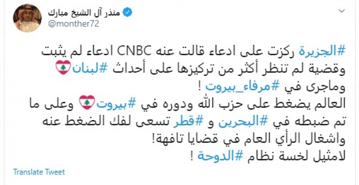 وقال في تغريدة عبر "تويتر" رصدها "المشهد العربي": "الجزيرة ركزت على إدعاء قالت عنه CNBC إدعاء لم يثبت وقضية لم تنظر أكثر من تركيزها على أحداث لبنان وما جرى في مرفأ بيروت".