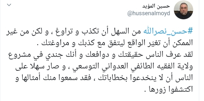 وكتب عبر تغريدة له على "تويتر" رصدها " المشهد العربي": "حسن نصرالله من السهل أن تكذب و تراوغ، و لكن من غير الممكن أن تغيّر الواقع ليتفق مع كذبك و مراوغتك، لقد عرف الناس حقيقتك ودوافعك وأنك جندي في مشروع ولاية الفقيه الطائفي العدواني التوسعي، و صار سهلا على الناس أن لا ينخدعوا بخطاباتك، فقد سمعوا منك أمثالها و اكتشفوا زورها ".