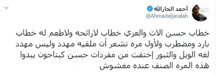 وكتب عبر تغريدة له على "تويتر" رصدها " المشهد العربي": "خطاب حسن الات والعزى خطاب لا رائحة ولا طعم له، خطاب بارد ومضطرب ولأول مرة تشعر أن ملقيه مهدد وليس مهدد، لغة الويل والثبور اختفت من مفردات حسن كبتاجون يبدوا هذه المرة الصنف عنده مغشوش".