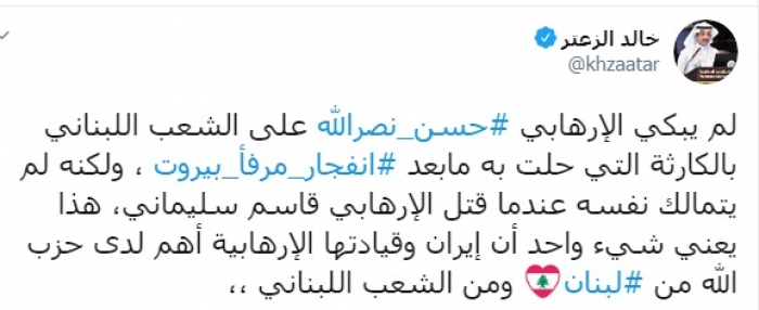 وكتب عبر تغريدة له على "تويتر" رصدها" المشهد العربي": "لم يبكي الإرهابي حسن نصرالله على الشعب اللبناني بالكارثة التي حلت به ما بعد انفجار مرفأ بيروت، ولكنه لم يتمالك نفسه عندما قتل الإرهابي قاسم سليماني، هذا يعني شيء واحد إن إيران وقيادتها الإرهابية أهم لدى حزب الله من لبنان ومن الشعب اللبناني".