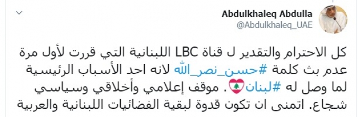 وكتب عبر تغريدة له على "تويتر" رصدها " المشهد العربي":"كل الاحترام والتقدير لقناة LBC اللبنانية التي قررت لأول مرة عدم بث كلمة حسن نصر الله لأنه أحد الأسباب الرئيسية لما وصل له لبنان، موقف إعلامي وأخلاقي وسياسي شجاع، اتمنى أن تكون قدوة لبقية الفضائيات اللبنانية والعربية".