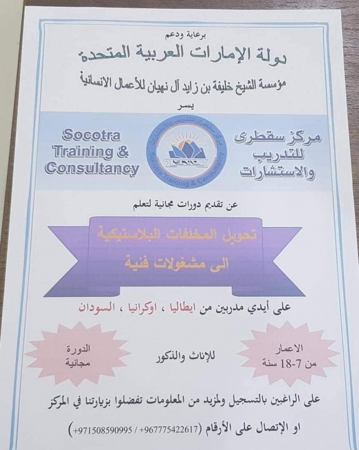 ودعت المؤسسة، أبناء الأرخبيل من عمر 7 وحتى 18 عامًا والراغبين في الحصول على الدورات، إلى زيارة مقر مركز سقطرى بمدينة حديبو لتسجيل أسمائهم.