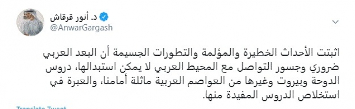 وكتب في تغريدة عبر "تويتر" رصدها "المشهد العربي": "أثبتت الأحداث الخطيرة والمؤلمة والتطورات الجسيمة أن البعد العربي ضروري وجسور التواصل مع المحيط العربي لا يمكن استبدالها، دروس الدوحة وبيروت وغيرها من العواصم العربية ماثلة أمامنا، والعبرة في استخلاص الدروس المفيدة منها".