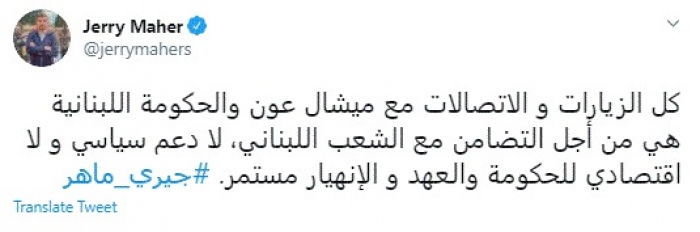 انتقد الكاتب الصحفي اللبناني جيري ماهر، اليوم، الرئيس اللبناني ميشال عون والحكومة اللبنانية، مؤكدًا أن الدعم العالمي للبنان جاء من أجل التضامن مع الشعب وليس النظام.
