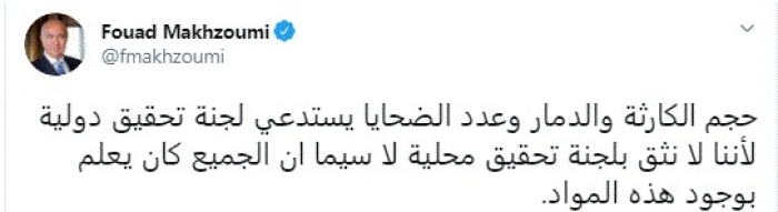 وقال في تغريدة عبر "تويتر" رصدها "المشهد العربي": "حجم الكارثة والدمار وعدد الضحايا يستدعي لجنة تحقيق دولية لأننا لا نثق بلجنة تحقيق محلية لا سيما ان الجميع كان يعلم بوجود هذه المواد".