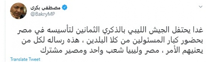وكتب في تغريدة عبر "تويتر" رصدها "المشهد العربي": "غدا يحتفل الجيش الليبي بالذكري الثمانين لتأسيسه في مصر بحضور كبار المسئولين من كلا البلدين، هذه رساله لكل من يعنيهم الأمر، مصر وليبيا شعب واحد ومصير مشترك".