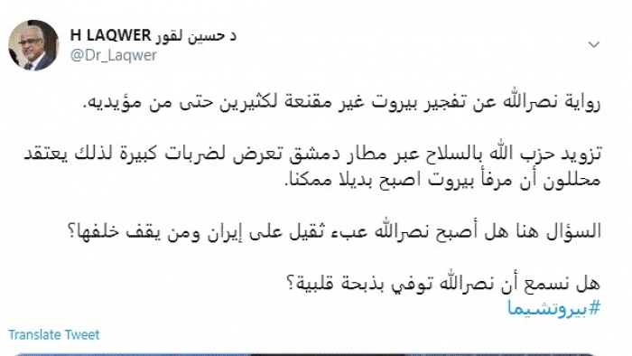 وكتب في تغريدة عبر "تويتر" رصدها "المشهد العربي": "رواية نصرالله عن تفجير بيروت غير مقنعة لكثيرين حتى من مؤيديه".