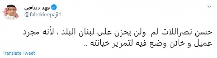 وقال في تغريدة عبر "تويتر" رصدها "المشهد العربي": "حسن نصراللات لم ولن يحزن على لبنان البلد، لأنه مجرد عميل وخائن وضع فيه لتمرير خيانته".