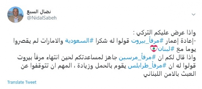 وقال في تغريدة عبر "تويتر" رصدها "المشهد العربي": "إذا عرض عليكم التركي إعادة إعمار مرفأ بيروت قولوا له شكرا السعودية والامارات لم يقصروا يوما مع لبنان".