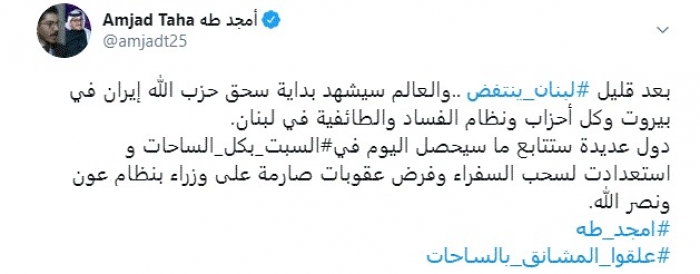 وقال في تغريدة عبر "تويتر" رصدها "المشهد العربي": "بعد قليل لبنان ينتفض ..والعالم سيشهد بداية سحق حزب الله إيران في بيروت وكل أحزاب ونظام الفساد والطائفية في لبنان".