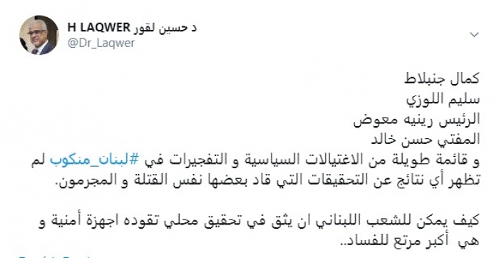 وكتب في تغريدة عبر "تويتر" رصدها "المشهد العربي": "كمال جنبلاط سليم اللوزي الرئيس رينيه معوض المفتي حسن خالد وقائمة طويلة من الاغتيالات السياسية والتفجيرات في لبنان منكوب لم تظهر أي نتائج عن التحقيقات التي قاد بعضها نفس القتلة والمجرمون".
