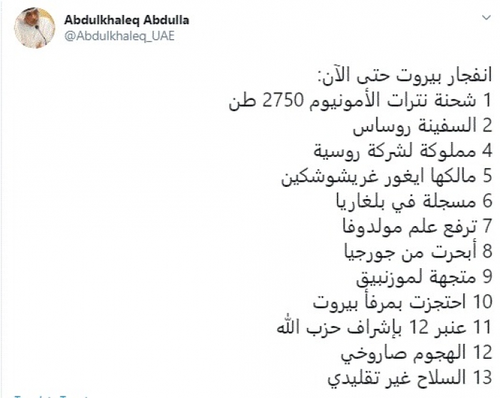كشف الأكاديمي والسياسي الإماراتي عبدالخالق عبدالله، اليوم، معلومات هامة عن انفجار مرفأ بيروت.