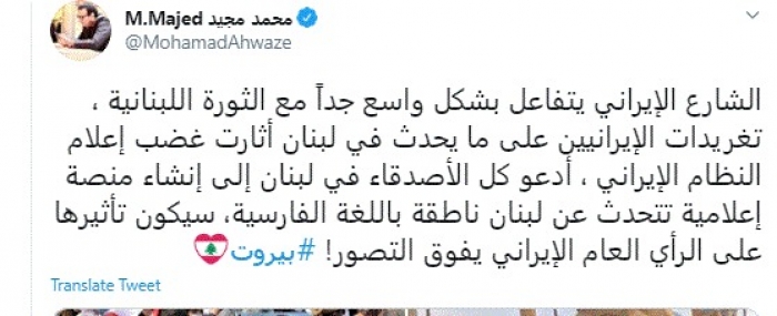 وقال في تغريدة عبر "تويتر" رصدها "المشهد العربي": "الشارع الإيراني يتفاعل بشكل واسع جداً مع الثورة اللبنانية، تغريدات الإيرانيين على ما يحدث في لبنان أثارت غضب إعلام النظام الإيراني".