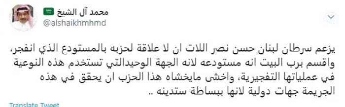 وقال في تغريدة عبر "تويتر" رصدها "المشهد العربي": "يزعم سرطان لبنان حسن نصر اللات أن لا علاقة لحزبه بالمستودع الذي انفجر، واقسم برب البيت أنه مستودعه لأنه الجهة الوحيدة التي تستخدم هذه النوعية في عملياتها التفجيرية".