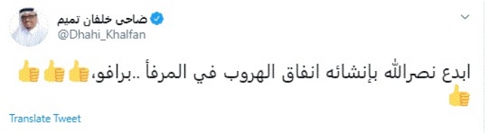 وقال في تغريدة عبر "تويتر" رصدها "المشهد العربي": "أبدع نصرالله بإنشائه انفاق الهروب في المرفأ.. برافو".