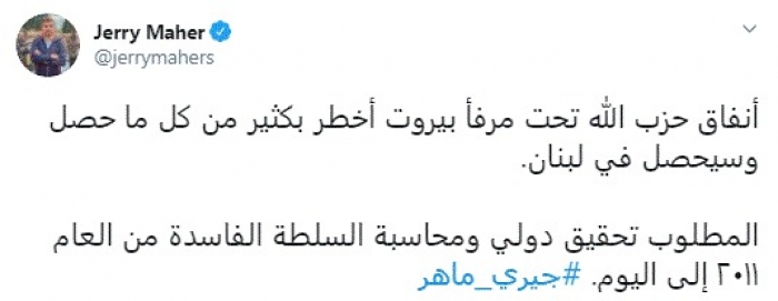 حذر الكاتب الصحفي اللبناني جيري ماهر، اليوم، من خطورة أنفاق حزب الله بمرفأ بيروت.
