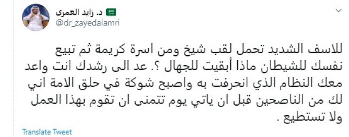 وقال في تغريدة عبر "تويتر" رصدها "المشهد العربي": "للأسف الشديد تحمل لقب شيخ ومن أسرة كريمة ثم تبيع نفسك للشيطان ماذا أبقيت للجهال؟".