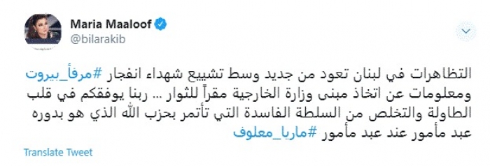 أعلنت الإعلامية اللبنانية ماريا معلوف، اليوم، مساندتها للثوار في لبنان بعد الانتفاضة التي شهدتها البلاد عقب انفجار مرفأ بيروت.