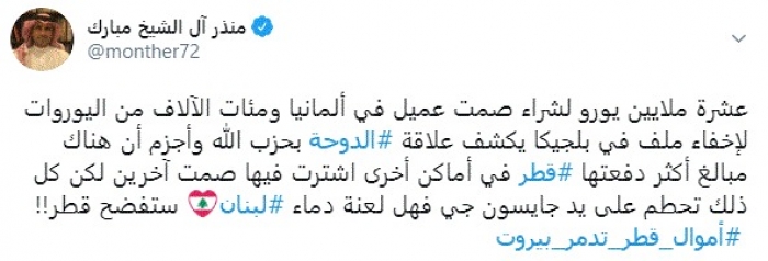 وقال في تغريدة عبر "تويتر" رصدها "المشهد العربي": "عشرة ملايين يورو لشراء صمت عميل في ألمانيا ومئات الآلاف من اليوروات لإخفاء ملف في بلجيكا يكشف علاقة الدوحة بحزب الله".